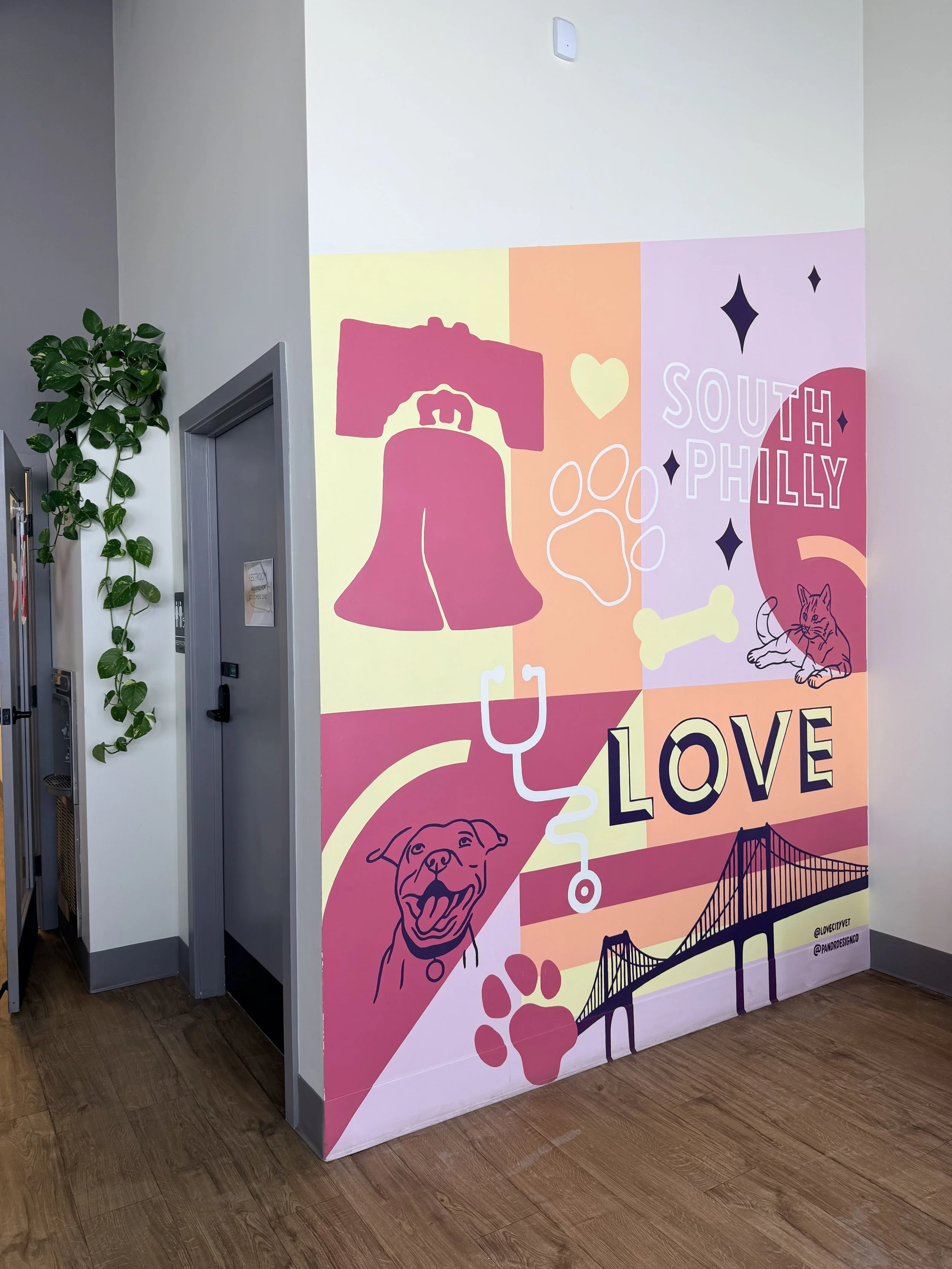 The goal of this mural was to help establish the visual identity of Love City Vet and create a space that that could calm nervous pets, comfort their owners, and reflect the heart behind this woman-owned small business. Since veterinary offices are often perceived as clinical or stressful environments, the goal for this mural was to do just the opposite. It needed to create visual interest without being overstimulating, and and feel instantly welcoming.