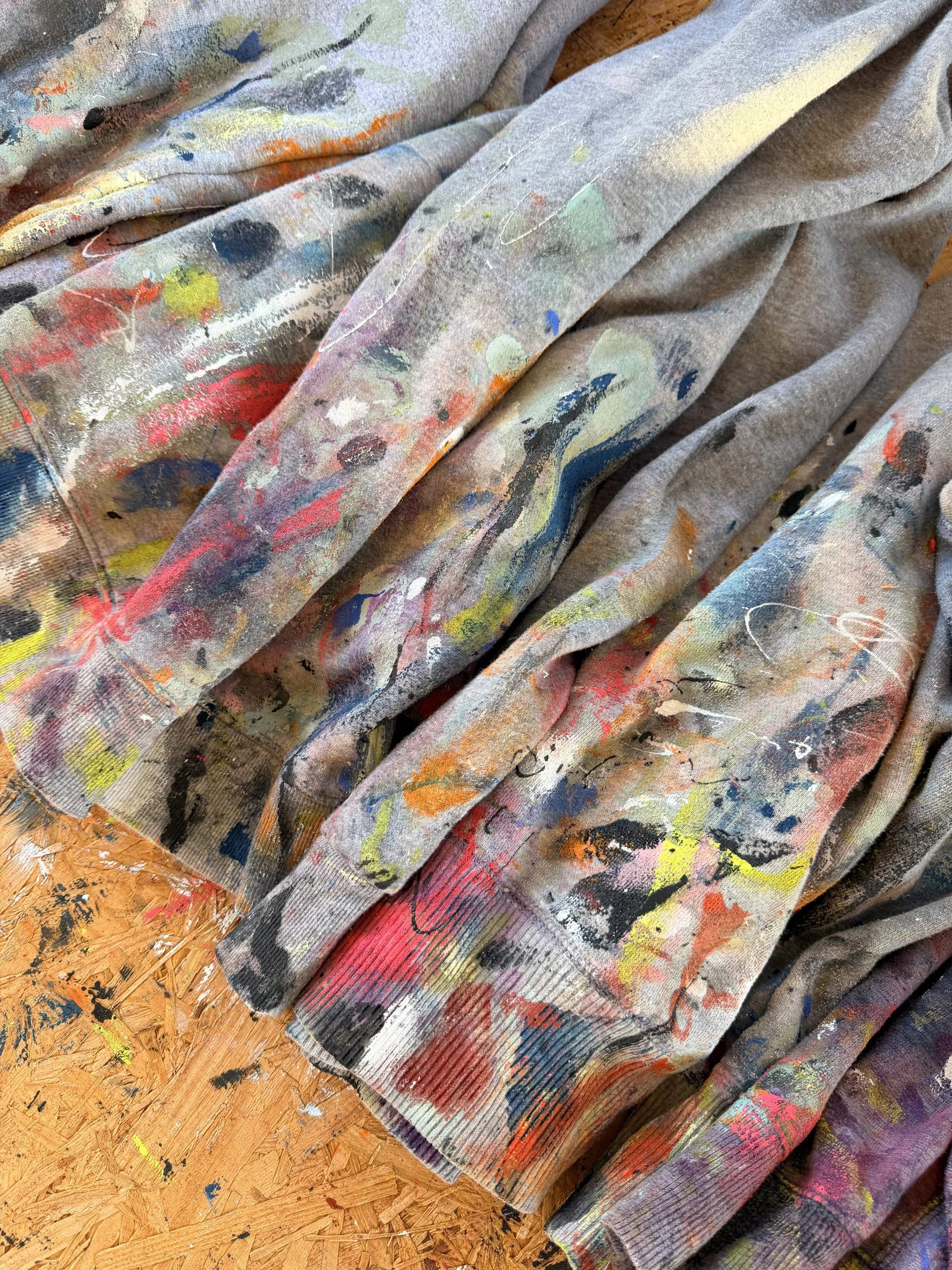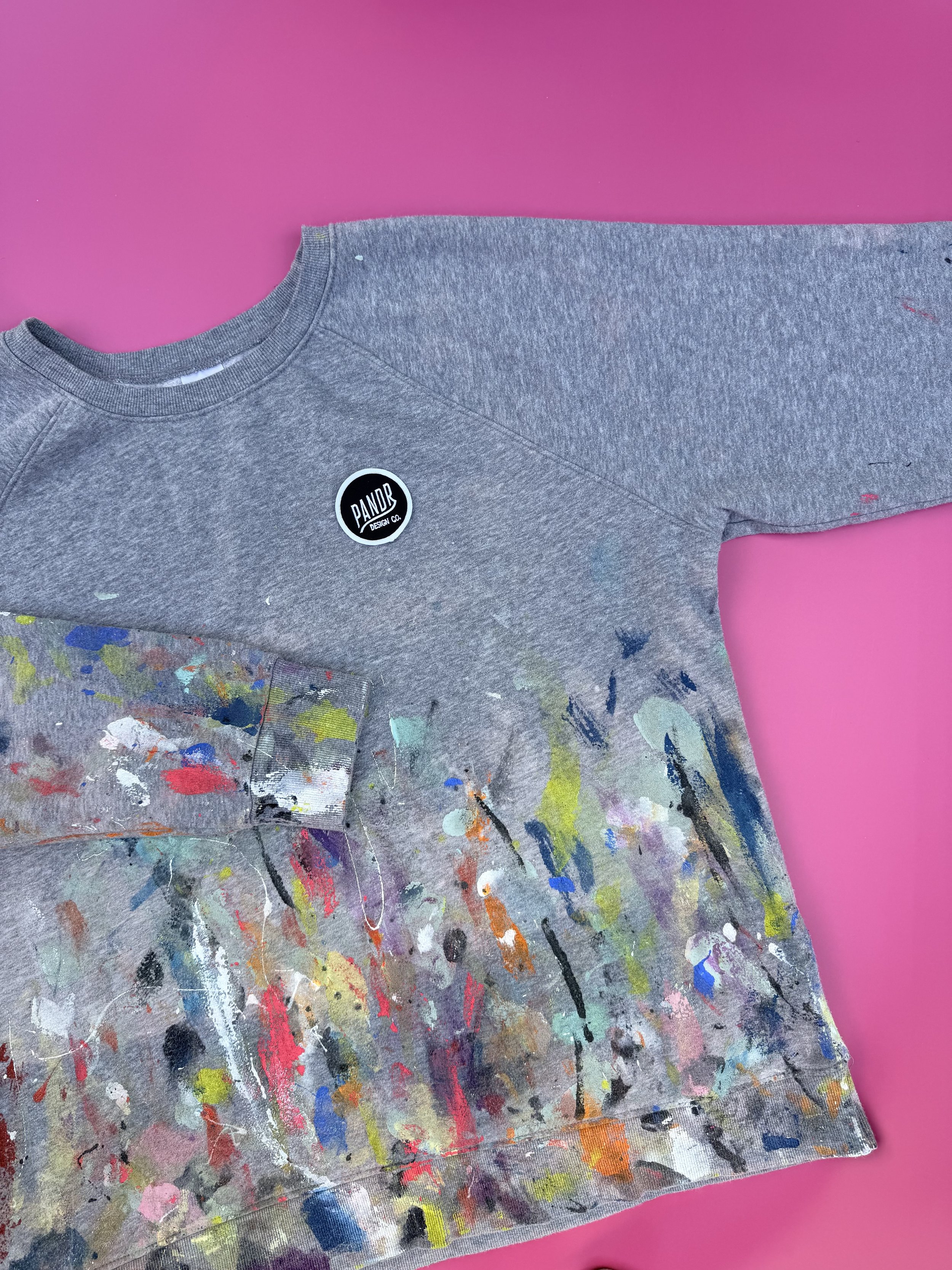 Each sweatshirt is custom bleach dyed by Phoebe, making every piece unique. These sweatshirts are thrifted and transformed with a distinct bleach dye technique and pre-washed. They are finished with an ironed-on Pandr patch for added detail.